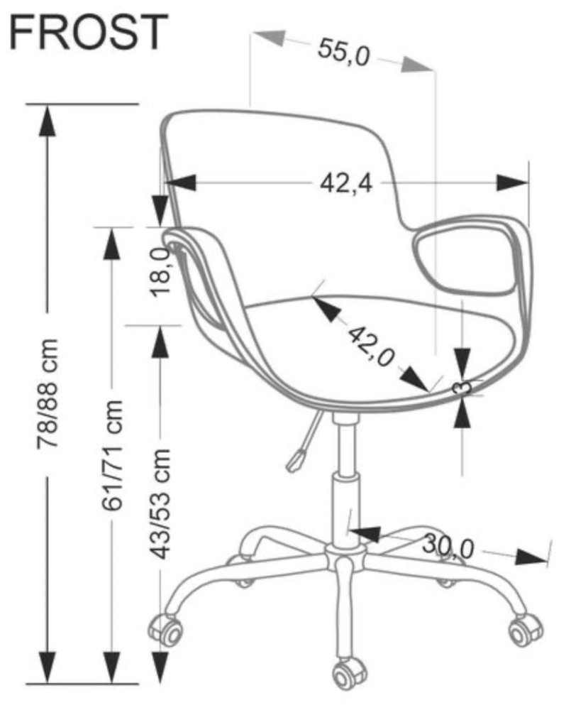 Otočná stolička FROST je moderný a pohodlný kus nábytku, ideálny do detskej miestnosti alebo do miestnosti pre študentov. Jej ergonomický dizajn poskytuje dostatočnú oporu chrbta, čo podporuje správne držanie tela pri štúdiu a odpočinku. Čalúnenie je vyrobené z materiálu odolného proti oderu. Mäkký sedák a pohodlné podrúčky zvyšujú komfort používania. Stabilné podnož a pevný rám zaručujú odolnosť a bezpečnosť.