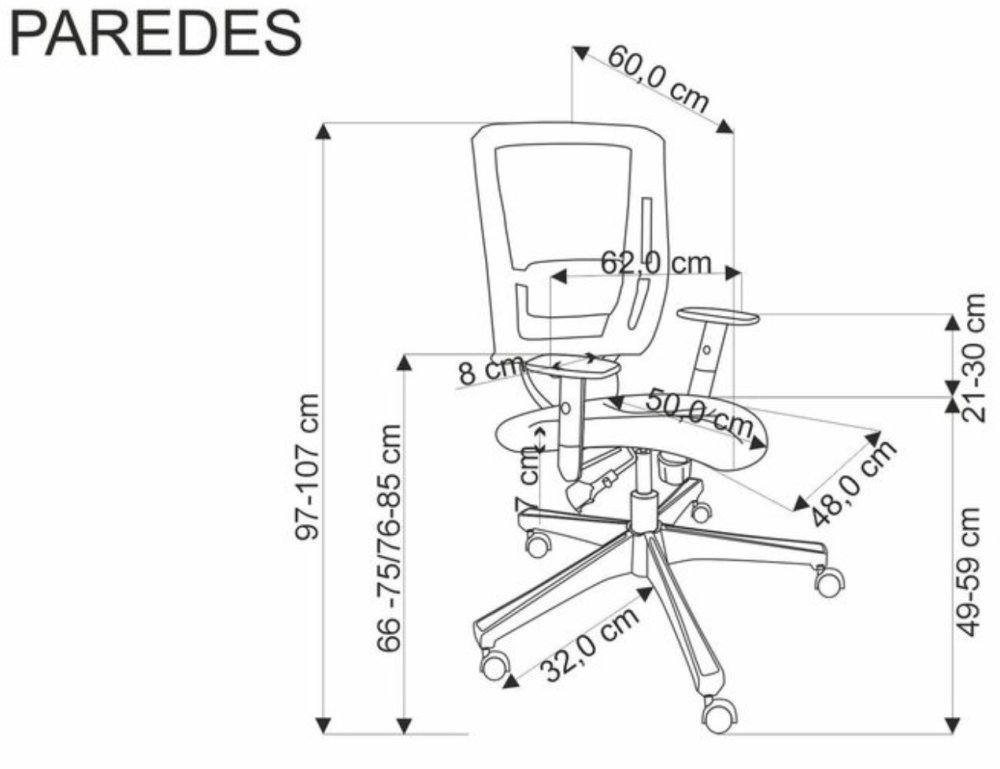 Nastaviteľné podrúčky sú ďalším prvkom, vďaka ktorému je kreslo PAREDES ideálnou voľbou pre ľudí, ktorí oceňujú individuálne nastavenia. Chrbtová opierka z odolnej sieťoviny poskytuje vynikajúcu ventiláciu, umožňuje pokožke dýchať a zabraňuje prehrievaniu tela pri dlhodobom sedení. Nastaviteľný chrbtový oporný bod poskytuje optimálnu oporu pre chrbticu a znižuje riziko bolesti.